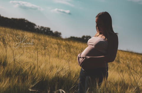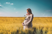 Le soir du solstice d'été, j'ai donné rendez-vous à cette jeune femme pour immortaliser l'attente de son premier enfant, sous un soleil descendant et dans les champs de blé couleur or :